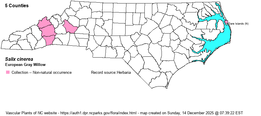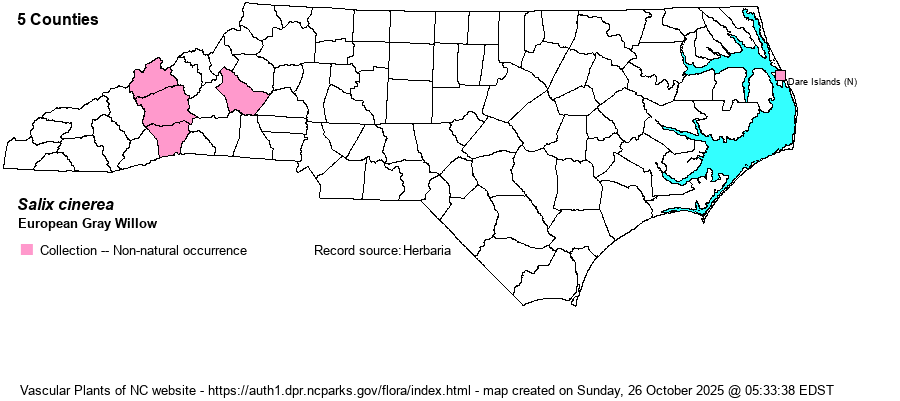 | Distribution | Mostly in the Mountains; disjunct to Roanoke Island in Dare County. We only include specimens annotated by G. Argus; some of them were originally determined as S. caprea.