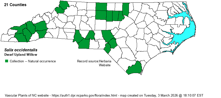 | Taxonomic Comments | This taxon has previously been considered as a variety of Salix humilis, as either S. humilis var. microphylla or S. humilis var. tristis. However, a few older references had these split into species, and this was typically named as Salix tristis. RAB (1968) did not even have these two fairly distinct taxa split out at all. Weakley (2018) and this listserve (NatureServe) are in agreement with splitting this out as a good species with the name of S. occidentalis.