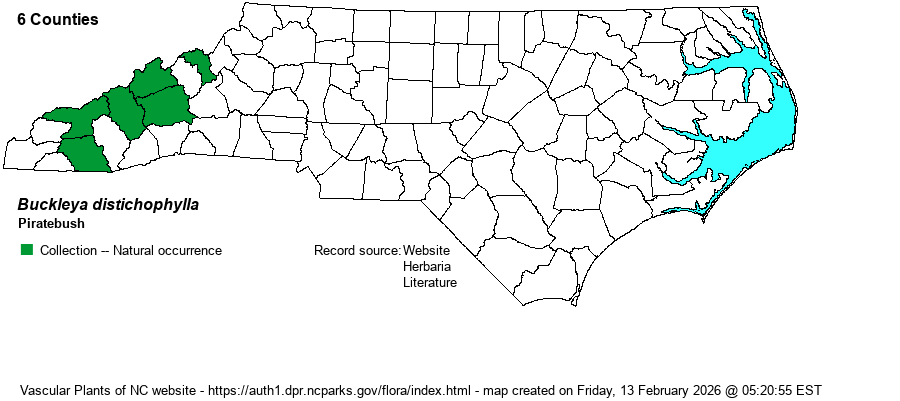 | Habitat | This unique species (though there are four other Buckleya species in Asia) grows only on dry bluffs or other steep slopes, often where rocky or there is loose soil. It usually grows under pines or at times under hemlock species, but it also is found in pine-oak/heath stands. Many sites are precarious to reach owing to steep conditions or to rocky or loose gravelly soil. A few decades ago, this root-parasite shrub was thought to be parasitic only on the roots of hemlocks, especially the scarce Tsuga caroliniana. Such is not the case, though it seems to be parasitic mainly on conifers, especially pines. | |