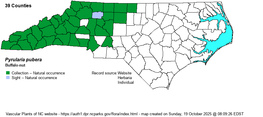 Phenology | Blooms in April and May; fruits from July to October. Unlike with its fellow family-mates Nestronia and Buckleya, the large and distinctive fruit (drupe), a greenish “acorn”, is often seen. | |