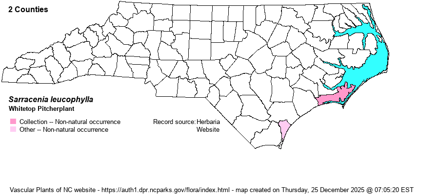 | Distribution | A single collection from Carteret County in 1990 by Bob Peet: edge of powerline on Nine Foot Road. Plants were observed here from 1989-late 1990s (later?); no doubt planted here. A 2020 photo on Facebook from New Hanover County is also available.
