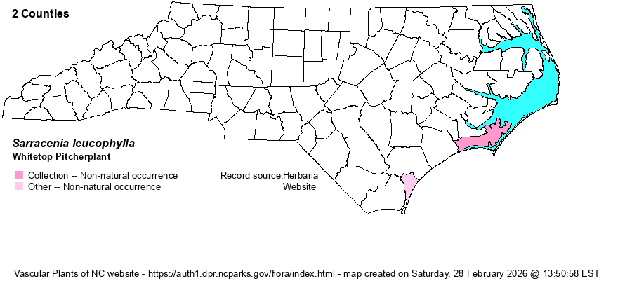 | Identification | This carnivorous plant is unmistakable with its 2-foot tall reddish-green to green trumpet-like tubes whose upper end and hood are bright white with red veins. The structurally similar S. flava, a native species in NC, has the tubes all green or yellow-green, often with reddish coloration on the upper ends. | |