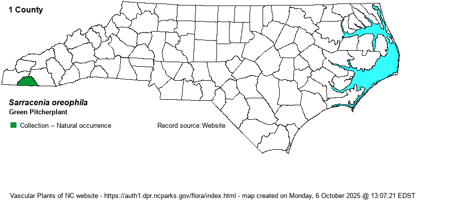 Identification | This species looks very similar to the much more common S. flava, which in NC is limited to the Coastal Plain and Piedmont. It has the similar tall (around 2 feet high) and tubular leaves that forms pitchers, a broad rounded hood a few inches above the pitcher opening, and a large single bright yellow flower with 5 drooping petals. However, this species has the flowering scape taller than the leaves, such that the flower is raised somewhat above the top of the trumpets, as opposed to a flower slightly below the trumpet in S. flava. The other feature is this species' many phyllodia (non-pitcher leaves) at the base, each of which is strongly falcate (curved); S. flava lack phyllodia or has just a few and these are straight or slightly curved. Though a biologist still might be able to find a new population of S. flava, it will likely be difficult to find a new population in NC of S. oreophila. At least, no full-scale survey of natural areas and rare plants for Clay County has been conducted by the NCNHP, and thus perhaps someone could turn up a new population in that county or in adjacent Cherokee County, though the latter county has had a recent natural area survey done. Note that, according to the Flora of North America website species account, "the pitchers do not last well into the summer and usually die down completely by mid-July". Thus, persons looking for the species need to search between April and early July. | |