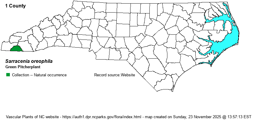 | Identification | This species looks very similar to the much more common S. flava, which in NC is limited to the Coastal Plain and Piedmont. It has the similar tall (around 2 feet high) and tubular leaves that forms pitchers, a broad rounded hood a few inches above the pitcher opening, and a large single bright yellow flower with 5 drooping petals. However, this species has the flowering scape taller than the leaves, such that the flower is raised somewhat above the top of the trumpets, as opposed to a flower slightly below the trumpet in S. flava. The other feature is this species' many phyllodia (non-pitcher leaves) at the base, each of which is strongly falcate (curved); S. flava lack phyllodia or has just a few and these are straight or slightly curved. Though a biologist still might be able to find a new population of S. flava, it will likely be difficult to find a new population in NC of S. oreophila. At least, no full-scale survey of natural areas and rare plants for Clay County has been conducted by the NCNHP, and thus perhaps someone could turn up a new population in that county or in adjacent Cherokee County, though the latter county has had a recent natural area survey done. Note that, according to the Flora of North America website species account, "the pitchers do not last well into the summer and usually die down completely by mid-July". Thus, persons looking for the species need to search between April and early July. | |