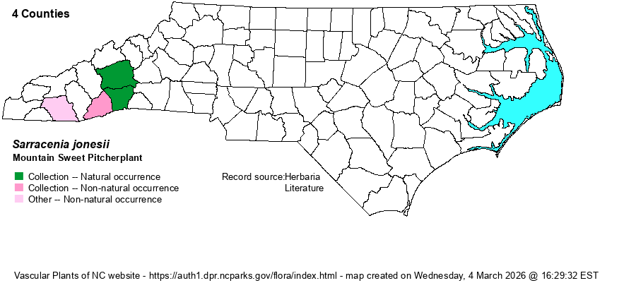 | Distribution | Occurs only in a small area of the southern Mountains, being certainly native in Henderson and Buncombe ("mountain bogs near Biltmore") counties. Records from Transylvania and Macon counties are of planted populations. This is a fairly recent split from Sarracenia rubra, and a few references still consider it as only a variety of that species, as S. rubra var. jonesii. Most, as does Weakley (2018), consider it as a valid species.
