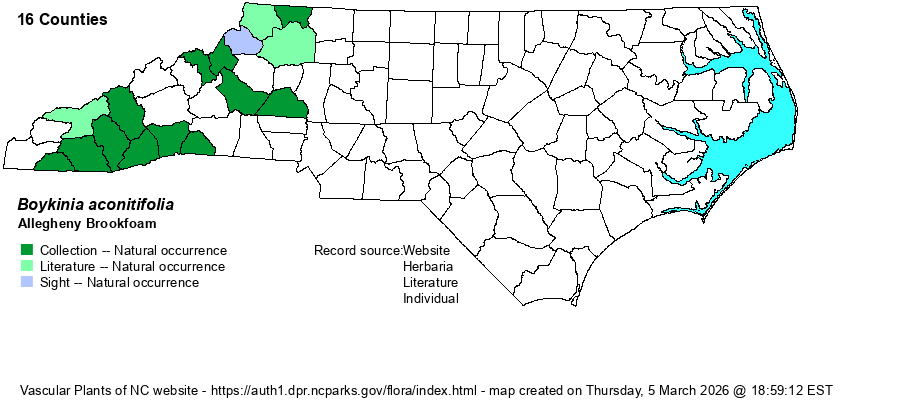 | Other Common Name(s) | Brook Saxifrage, Eastern Boykinia, Aconite-saxifrage. The common name is often written with a hyphen (Brook-saxifrage), as it is not a true saxifrage (most now in the genus Micranthes). Allegheny Brookfoam seems to be a relatively newly coined common name, but it has taken off, used now by a great many websites and references. | |