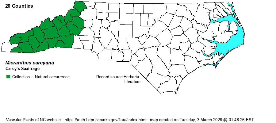 | Taxonomic Comments | The species formerly in the genus Saxifraga in NC have now all been moved to the genus Micranthes. As mentioned above, the taxonomy of this species and M. caroliniana has been confused in the past, and it is highly likely that some herbarium specimens are misidentified.