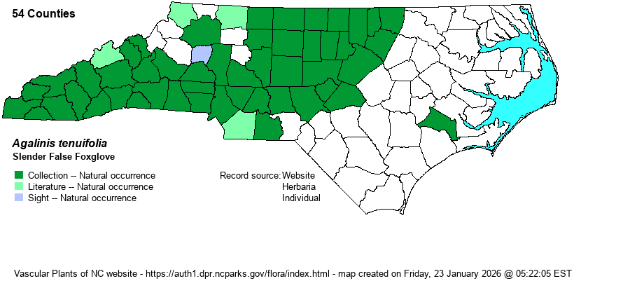 | Identification | This is a rather small to medium herb, growing to about 1 foot tall, but is quite slender. It has several branches from the upper part of the stem, and numerous very needle-like opposite leaves, each about 1-inch long. In general vegetative look, it is similar to several other Agalinis species of dry places, such as A. setacea and A. decemloba; however, the flowers of this species are completely unlike any others. Each of the few flowers that terminate a branch have the upper 2 lobes arched downward to nearly cover or shade the opening; otherwise, the flower is rose-pink and about 2/3-inch long and across. This species does not usually occur in large colonies as to color a wooded margin completely rose-pink. However, it is moderately widespread, such that active biologists should encounter it fairly frequently, at least when the flowers emerge in very late summer or fall. | |