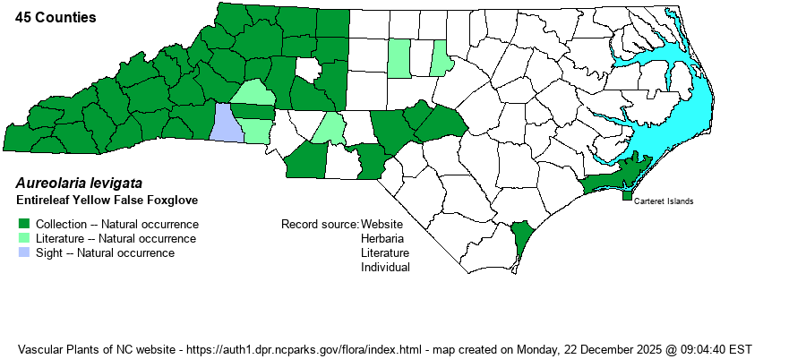 | Identification | This is a rather tall and wand-like herb, growing essentially without branches to about 3 feet tall, rarely to 4 feet tall. It has a smooth stem, with numerous pairs of opposite leaves. Unlike with the other four species in the genus in NC, this one has essentially only entire leaves (with no lobes); leaves are narrowly lanceolate, about 3 inches long and 2/3-inch wide, becoming smaller up the stem. Lowermost leaves are rather toothed or incised, but never to the degree of A. flava. The inflorescence is a terminal raceme, from leaf axils, such that the upper 6 inches of the plant are covered in large, bright yellow, bell-shaped flowers. Each flower reaches about 1.3 inches long and nearly as wide, about the same size and shape as on the other Aureolaria species. This is a reasonably widespread species in the western half of the state, and if you hike along upland hardwood trails in August and September you have a decent chance of seeing this entire, unlobed-leaved species, like others in the genus very showy and impossible to overlook when in bloom. | |