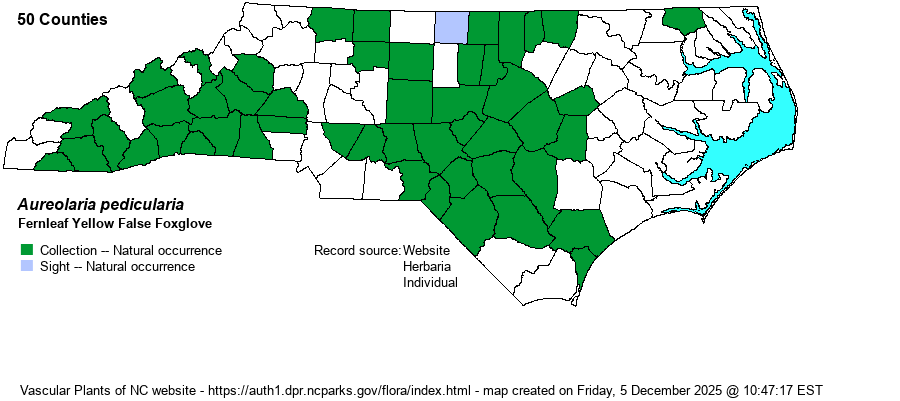 | Habitat | This species, as with A. pectinata, occurs in dry and usually sandy soil. It is most often seen in sandy Coastal Plain sites such as pine/scrub oak sandhills, on sand rims, and other sandy edges. In the Piedmont and Mountains, where sands are less numerous, it is most often found on dry wooded borders and openings of upland woods, and on dry roadbanks. It is a root parasite on oaks, and thus oaks must be present near the plants. | |