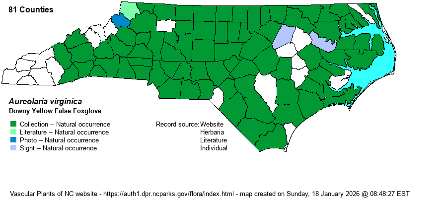 | Abundance | Frequent to common in the Piedmont. Fairly common in most of the Coastal Plain, though locally uncommon. Infrequent to fairly common in the central and southeastern Mountains. This is the most common of the five Aureolaria species in the state, and the only one with a State Rank of S5. | |