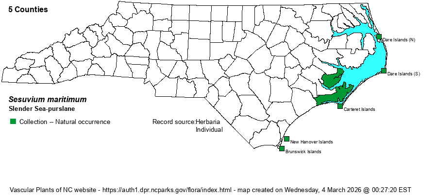 | Abundance | Rare to sporadically uncommon, as it is an annual and thus numbers vary from site to site from year to year. This is now a State Endangered species. Its State Rank might be closer to S1S2 instead of the NCNHP's S1, but more information on recent populations is needed. Neither species of sea-purslane is well-collected or reported in recent years (except Dare County in 2012-13 and Pamlico in 2021), perhaps owing to difficulty in collecting in protected areas, or simple apathy for small coastal plants. | |