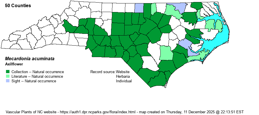 | Identification | This is a small to medium-sized, erect herb with a mostly unbranched to sparingly branched stem to about 1 foot tall. It has scattered pairs of opposite leaves along the stem, as in the Gratiola and Lindernia species, and might be confused with members of those genera. However, in this species the leaves are clearly wider toward the tip, being oblanceolate, tapered to the base, and minutely serrated toward the tip; each is about 1.3 inches long but only 1/4 as wide. Leaves in those other genera are wider toward the base or are elliptic to linear; most are also smaller than on Mecardonia. From many of the leaf axils grow the flowers on noticeably long pedicels, each stalk being nearly 1-inch long and ascending. The flowers are about 2/5-inch long, tubular, and with purple lines on the lower lip. When in bloom, the species is conspicuous by the many white flowers well away from the stem and usually on ascending stalks. Mostly however, you should identify this slender wetland herb by its paired, oblanceolate leaves. Thankfully, observers in the middle parts of the state should encounter this species fairly often, less so toward the coast. | |
