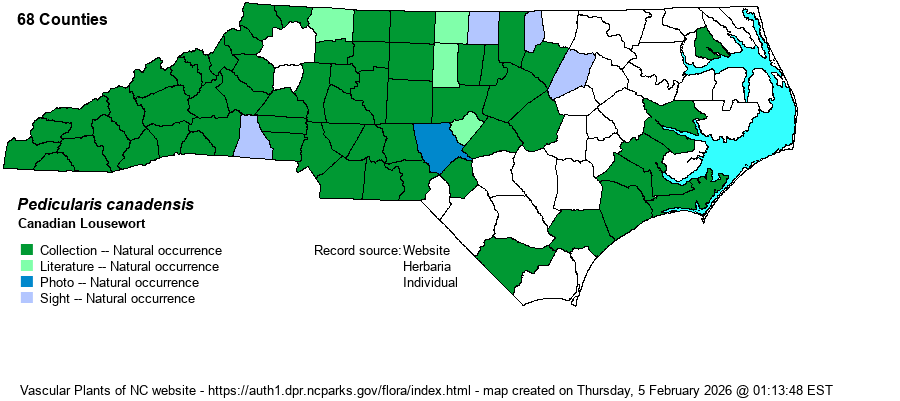| Identification | This is a familiar spring wildflower over the Piedmont and mountains, growing in the same places where many other spring-blooming plants are found. It is rather small, reaching only about 6-9 inches high. It has a basal rosette of numerous leaves, each being about 2 inches long and about 3/4-inch wide, highly dissected into about 10 or more pairs of pinnate lobes, quite fern-like. The single stem has a few pairs of opposite leaves, quite similar to the basal leaves but smaller, each strongly pinnately divided. The top of the stem is a very compact spike of a dozen or more medium-sized flowers, mostly tubular but with a hooded appearance, the top lobes curing down over the opening of the flower. Each flower is nearly 1-inch long, yellow to reddish-purple (often a mixture of yellow and purplish), and the effect is a rounded, bushy-looking inflorescence that is 1-2 inches across. Normally, the species can be identified just from the cluster of highly-dissected basal leaves, but the rounded cluster of numerous flowers is bound to catch attention. Though it can be local in a given county, not found in all suitable habitat, it normally can be seen on every few spring wildflower trips in the mountains and Piedmont. | |
