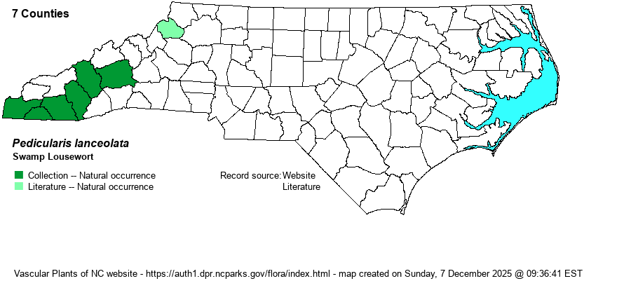 | Abundance | Very rare in the southern Mountains, with about four or five extant records, according to the NCNHP database (and about five additional historical records). Now of historical occurrence north of Haywood and Buncombe counties. This is a State Threatened species. | |