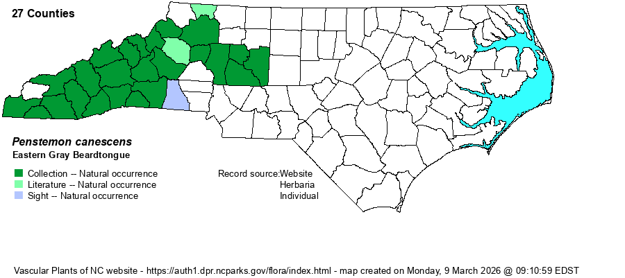 | Abundance | Common over most of the Mountains, being the most numerous Penstemon in that province. Uncommon in the west-central Piedmont, and probably north to the VA border (though records lacking in some of these northwestern Piedmont counties, but widespread just over the border in VA). Rare in the southwestern Piedmont. The editors has justifiably re-ranked the species as S4. | |