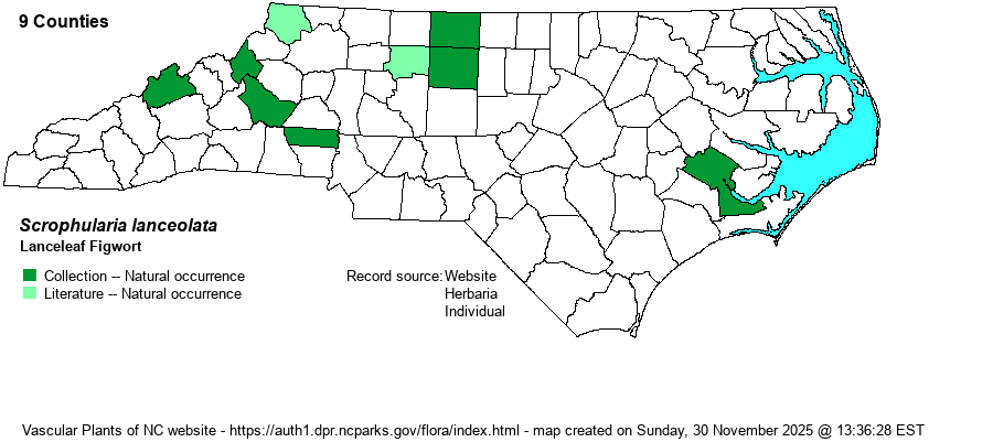 | Habitat | One would think that the rarer of the two Scrophularia species in NC would have the more specific and scarce of the habitats in the state, but the opposite seems to be true. Whereas as S. marilandica occurs mostly on the infrequent high pH soil areas in the state, S.lanceolata occurs in typical dry to dry-mesic upland hardwood forests, probably over slightly acidic soils. The only reason for its scarcity in such common habitats must be that it favors cooler microclimates than regularly found in NC. However, one must wonder if the Craven (and possibly Jones) record was from a forested area over marl (high pH soil), as species usually disjunct from the Piedmont to those counties tend to be ones that grow on high pH soil. One website editor (Sorrie) has seen this species in several prairie and grassy woodland habitats in the Midwest; this suggests that in the East it originally may have occurred in prairie-like openings. | |
