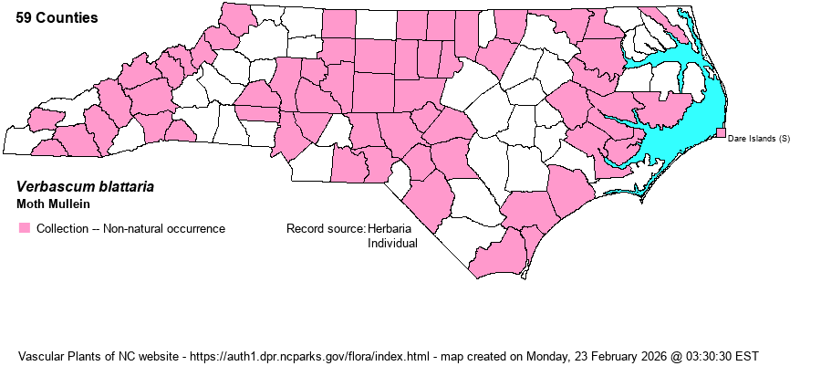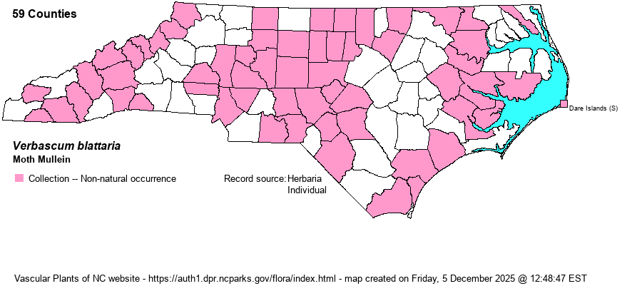 | Identification | This mullein has a very erect and essentially unbranched stem reaching 2-3 feet tall. Its long inflorescence -- a narrow raceme -- is widely interrupted the whole length. The flowers are large and white, rarely yellow. | |