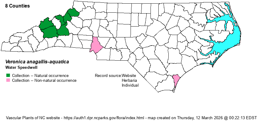 | Abundance | Very rare to rare, in the central Mountains. Ought to occur in the northern Mountains (Alleghany and Ashe), as this is a Northern species. Extremely rare in the Piedmont close to the Mountains; escaped elsewhere. The NCNHP considers this starting in fall 2022 as a Significantly Rare species, with a State Rank of S1. Weakley (2018) does state: "Some authors interpret V. anagallis-aquatica as being strictly non-native in North America", though he does consider the species as native in VA, western NC, and TN northward on his range map. | |