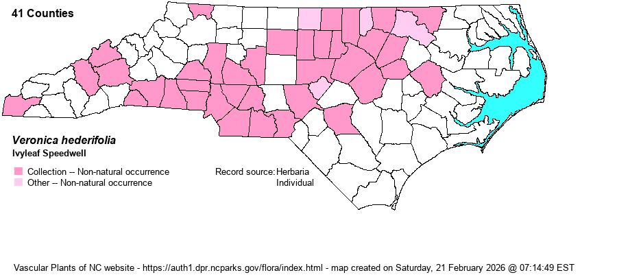 | Habitat | Floodplain forests, creek and river banks, campus lawns, yard weed, NC Welcome Center (Cleveland Co.), town park, vineyard, field, waste ground. This can be a troublesome weed in many floodplain forests, especially rich ones with a diverse herb layer, as it often competes with species such as Nemophila aphylla, Corydalis flavula, Enemion biternatum, and other very small native spring ephemerals. | |