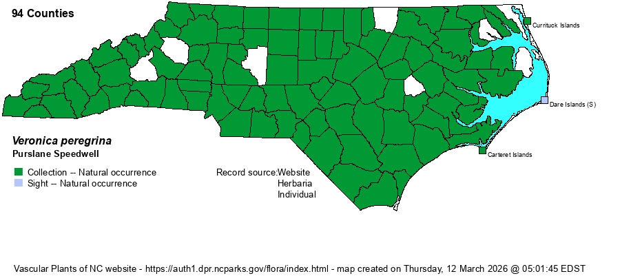 | Taxonomic Comments | There are several varieties in the US. Weakley (2018) considers that the nominate one -- Veronica peregrina var. peregrina -- is the only one in NC.