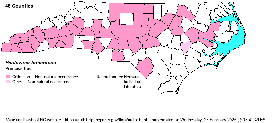 | Identification | This non-native tree is a familiar one in the state, especially so in the western parts. It is easily identified by the combination of small to medium tree, abundant and large lavender-violet, tubular flowers, and large broadly ovate leaves -- often 6-10 inches long and wide. The large brown, rounded capsules are easily seen in fall and winter, as they are arranged in a conical panicle. | |