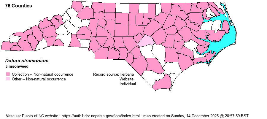 | Identification | Jimsonweed is familiar to most folks, being a very robust and bushy herb, with huge white trumpet-like flowers. It is similar to D. inoxia, but its flowers are shorter -- under 4 inches long vs. more than 4 inches long in that rarely seen species. | |