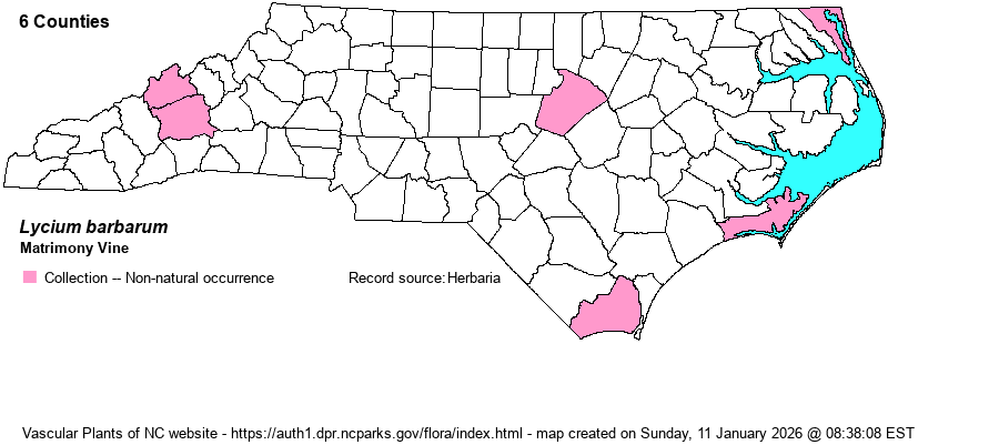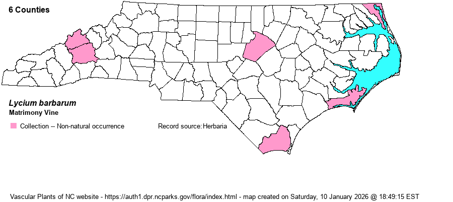 | Distribution | Widely scattered in the outer Coastal Plain, lower Piedmont, and the Mountains. Specimens from Forsyth, Guilford, Mecklenburg, and Orange counties are misidentified or from cultivated plants.
