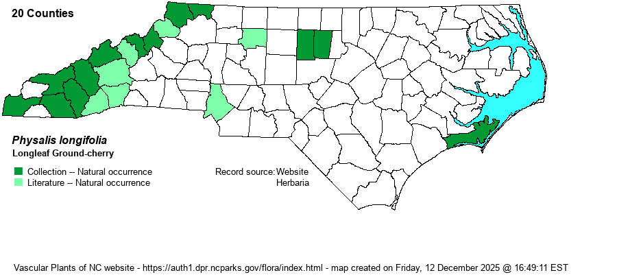 | Distribution | Essentially throughout the Mountains, though possibly absent in the southeastern portion along the Blue Ridge Escarpment. As the species ranges eastward into the VA Piedmont, it is to be looked for in the northwestern Piedmont of NC. There are single collections in SERNEC that have been fairly recently confirmed as this species from downstate -- Alamance, Orange, and Carteret counties. The iNaturalist website also has a few Piedmont records as Research Grade. Weakley's (2024) map does show the species as "rare" in the Piedmont and Coastal Plain of many Southeastern states, including NC; its main range is mainly north and west of NC.