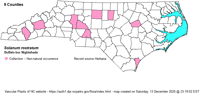 | Identification | Buffalo-bur is easy to identify, with its bright yellow flowers and yellowish spines all over the stems, branches, leaves, and fruits. The leaves are also quite dissected for a Solanum, with numerous deep sinuses and rounded lobes. Essentially all others in the genus in NC have white or purple flowers. | |