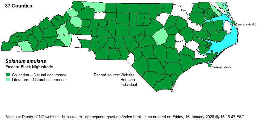 | Taxonomic Comments | This species has been shuffled around quite a bit in name over the decades. Most references called it as S. nigrum in the past, and then some moved it to S. americanum, which Weakley (2018) says is a misapplied name. Most recently, in a 2019 paper by Sandra Knapp, it has been treated as S. emulans Rafinesque.