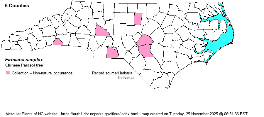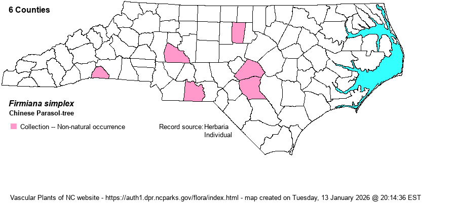 | Identification | Chinese Parasol-tree may grow to be a tree 60 feet tall. Young bark is green with pale streaks, later becoming gray. The leaves are broader than long (or about the same), shallowly cut into 3 lobes (or with 2 more small lobes), and may exceed 2 feet long and wide. The flowers occur on large open panicles; sepals 5, petals apparently absent. The fruits are lance-shaped or narrowly ovate. | |