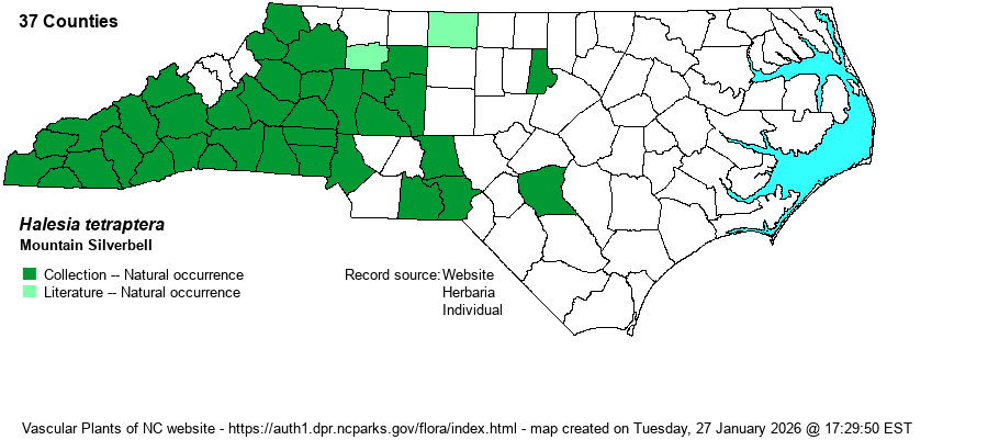 | Taxonomic Comments | For most of the 20th Century, this species was named as Halesia carolina. Recent taxonomic work has now moved the former Little Silverbell (H. parviflora at that time) to the H. carolina scientific name; now, the former H. carolina [Mountain Silverbell] has the name of H. tetraptera.