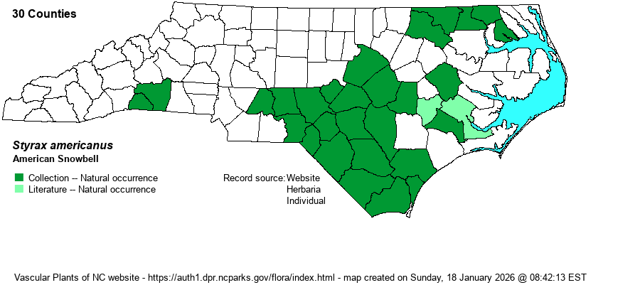 | Taxonomic Comments | Weakley (2018) and some other references split the species into varieties; the one in NC is the nominate form – S. americanus var. americanus. Into much of the last century, the species was named as Styrax americana.