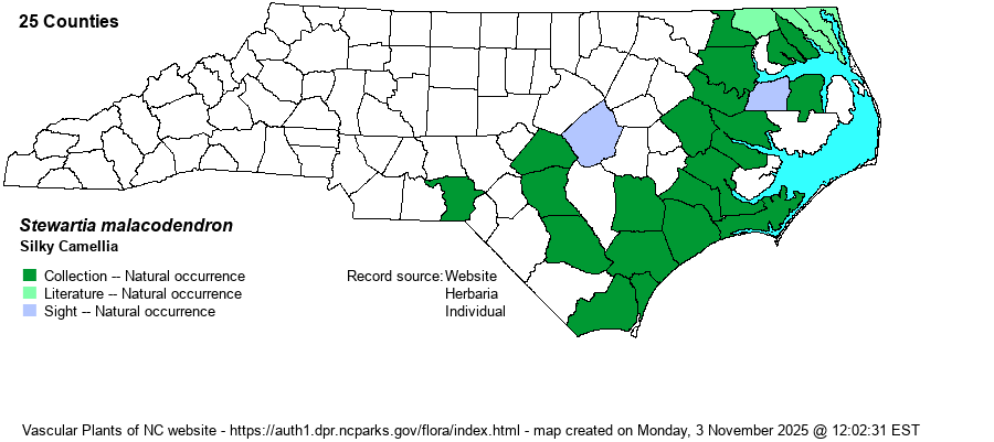 | Distribution | Scattered over most of the Coastal Plain, particularly from the southeastern coastal counties and extending northward in a narrow band near the Suffolk Scarp (western ends of both Albemarle and Pamlico sounds) to Hertford and Currituck counties. Specimen records from the Piedmont and Mountains are likely misidentifications of S. ovata, if not planted or escaped individuals. The Richmond County specimen is from the lowermost Piedmont, Hitchcock Creek 0.7 mile from Pee Dee River.