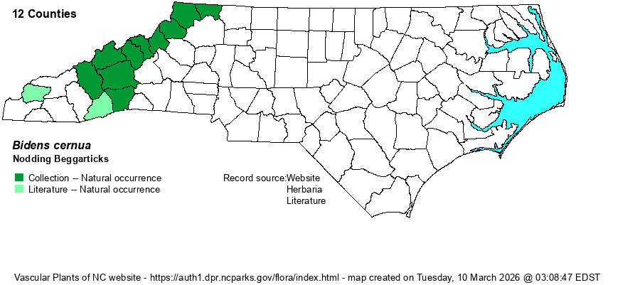 | Identification | The common name provides an important clue: the large heads face outward or even downward. Plants are annual, averaging about 2 feet tall, with the stems often rooting at lower stem nodes. The upper portions of the stems are rather erect. The ray florets are showy, and the spread flower is about 1-inch across. The leaves are opposite and not lobed or dissected (as in most Bidens species). Smooth Beggarticks (B. laevis) is very similar but the heads do not nod and the rays are 17 mm or more long, yielding a flower head up to 1.5-2 inches across. Also, that species grows only in the eastern parts of the state, with no range overlap in the state. | |