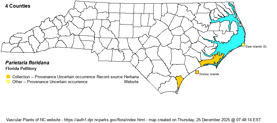 | Distribution | Coastal or near-coastal, north to Cape Hatteras (Dare County). The only confirmed record is a specimen from the riverfront in Wilmington, New Hanover County (Nelson 15514 et al. NCSC, USCH, WILLI). SERNEC specimens are also from Morehead City on mainland Carteret County and in coastal Onslow County. There are Research Grade photos for the Cape Hatteras area of coastal Dare County. Easily confused with P. praetermissa. Weakley (2018) considers it as native in NC, though the NCNHP is not as sure. The editors feel that it is likely not native, if the only confirmed record is from a city waterfront, where many exotic/naturalized species are found. The specimen and other sight records for mainlnad Carteret are also on cracks in pavement or other man-made places. In 2022 Sorrie checked the ID of all P. floridana and praetermissa at NCU and those with images online at SERNEC.