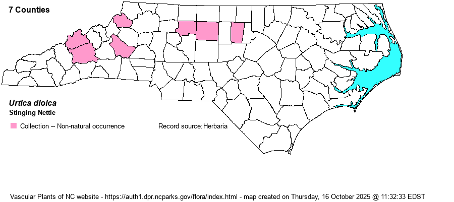 Distribution | Mostly Mountains, also northern Piedmont. The specimens from the Mountains are from natural habitats, notably along the French Broad River. Interestingly, one specimen at herbarium IND from Madison County (Radford et al. 45159) was annotated to the native subspecies gracilis, whereas duplicates at other herbaria were annotated to the alien subspecies dioica. FNA maps both along the Appalachians south to NC, TN, and GA. To resolve this quandary it will be necessary to examine specimens in hand. Meanwhile, website editors will map both taxa in the Mountains, with non-natives in the Piedmont.