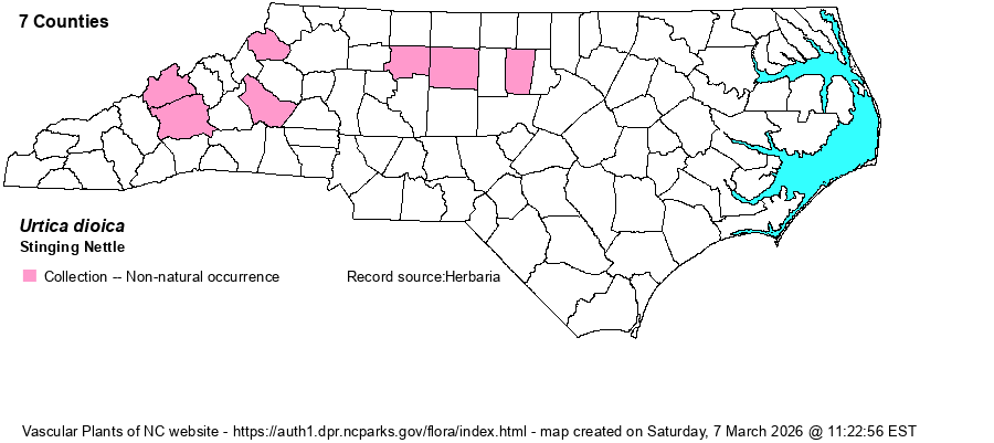 | Distribution | Mostly Mountains, also northern Piedmont. The specimens from the Mountains are from natural habitats, notably along the French Broad River. Interestingly, one specimen at herbarium IND from Madison County (Radford et al. 45159) was annotated to the native subspecies gracilis, whereas duplicates at other herbaria were annotated to the alien subspecies dioica. FNA maps both along the Appalachians south to NC, TN, and GA. To resolve this quandary it will be necessary to examine specimens in hand. Meanwhile, website editors will map both taxa in the Mountains, with non-natives in the Piedmont.