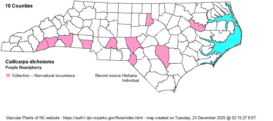| Identification | Purple Beautyberry has a much different aspect than American Beautyberry (C. americana). This exotic species is less than half as tall and with far fewer branches. The leaves are narrowly elliptical and tapered to both ends, considerably smaller and more crowded on the branches than in the native species. The small pink flowers grow from axils in few-flowered cymes on slender stalks; the numerous rounded fruits are purple-violet, rather like in the native species, whose berries average somewhat more magenta and less violet. | |