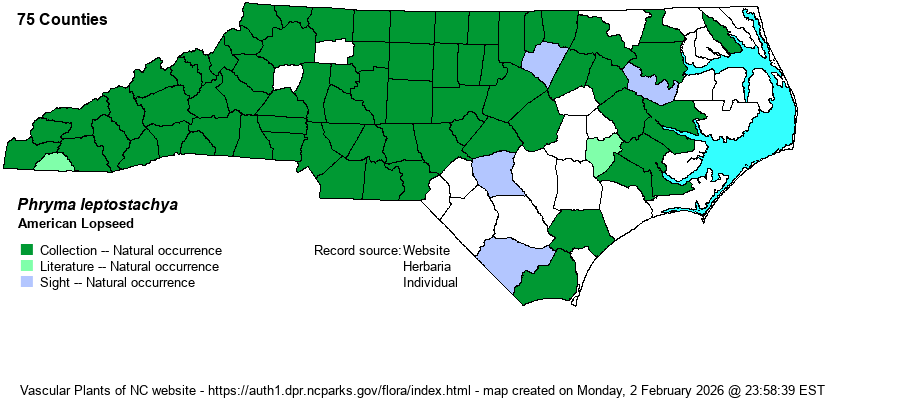 | Identification | This species was formerly in is own genus and family, but several other species have been moved into the Family Phrymaceae. At any rate, this is a unique species in the U.S., as it has very odd fruit. In leaf, it is a medium-sized herb, growing to 1.5 feet tall. It has a 4-angled stem, with only a few pairs of opposite leaves. Each leaf is ovate, about 4 inches long and about 2 inches wide, serrate, and with a short petiole; the base is somewhat truncate (squared off). Normally, each pair of leaves is at right angles to the pair above and below it, so that the leaves are not stacked on top of another. The top 6-10 inches of the stem contains the very slender inflorescence, essentially a "naked" spike, with 10 or more pairs of small and narrow tubular flowers opposite another. Each is white or with a pinkish tinge, about 1/4-inch long, bilaterally symmetrical (with a long lower lip) and held distinctively horizontal. Shortly after a flower is finished, it droops downward and essentially "clasps" the stem! Thus, the fruit has "lopped", giving rise to the common name. Though quite a few other species have similar fairly broadly ovate opposite leaves, making it tricky to identify by many biologists at that stage, when in bloom or fruit it is unmistakable. Quite a few rich hardwood slopes in the mountains and Piedmont contain a colony or two of this species, and it does indeed often grow in sizable stands as opposed to just a few scattered individuals. | |