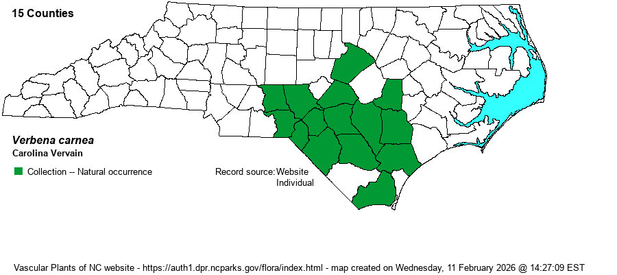 | Other Common Name(s) | Carolina False Vervain. The use of the word "False" should be used when the species is included in the genus Stylodon. However, as it is listed by Weakley (2018) in Verbena, the "Vervain" genus, it is best to call it as Carolina Vervain for the common name, as do Sorrie (2011) and Weakley (2018). | |
