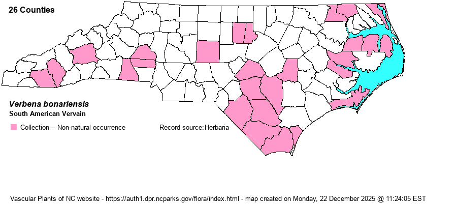 Native of South America; in N.A. NC to GA -- as mapped by BONAP and Weakley (2018), but this is probably incomplete. | |