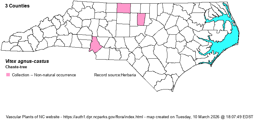 | Identification | Chaste-tree is a fairly large shrub to small tree, growing up to 10-12 feet tall and wide; it is often seen planted in yards and arboretums. It is easily identified by its leaves palmately divided into 5 slender leaflets, each dark above and pale gray beneath (due to dense hairs). The inflorescences are elongate spikes that are pale gray with pubescence. The small flowers are deep blue-violet. | |