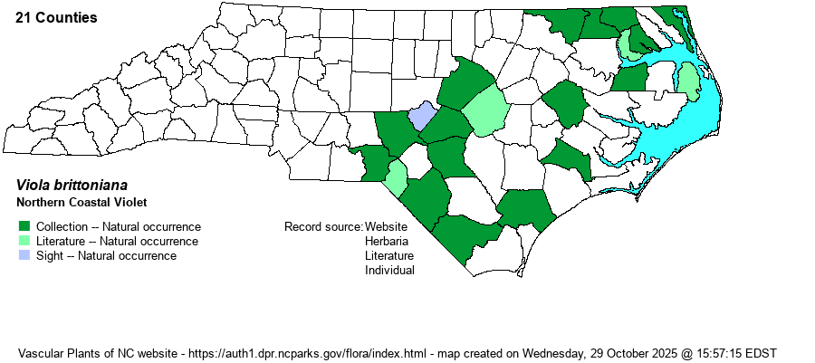 This is a violet with an odd range for the genus, limited to the Coastal Plain and somewhat Northern, as well. It ranges from eastern MA south to SC, ranging west barely to eastern PA.
