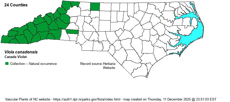 | Identification | This is one of the most robust and tallest of our violets, often reaching 12-15 inches tall. It is one of only two caulescent (leafy along the flowering stalks), white- or cream-flowered violets in NC. It has both basal leaves and scattered stem leaves, each with heart-shaped blades and the basal with petioles up to 4 inches long. The scattered flowers are white with a yellow center and some purple lines in the throat and purplish tinge on the back of the petals; each is rather large and about 1-inch across. The only similar species is V. striata, which has cream-colored to white flowers, no yellow on the base of the petals, nor any purple on the back of the petals. Also, it has very large, leafy stipules at the base of each stem leaf. V. canadensis is a favorite spring wildflower of our cove forests, seen in many or most suitable rich coves, often in large stands that block the ground. | |