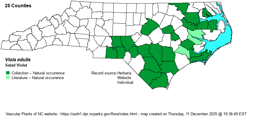 | Distribution | Scattered over much of the Coastal Plain, though most prevalent in the southern portion, especially in the Sandhills region. Ranges into the edge of the Piedmont. Exact details of the range are not well known owing to confusion about specimen identities, and biologists' unfamiliarity with it, as most specimens were collected when it was named as V. palmata or V. esculenta. Specimens from the Piedmont are not correctly identified, as determined by one of the website editors (Sorrie), and by Ballard in 2024.