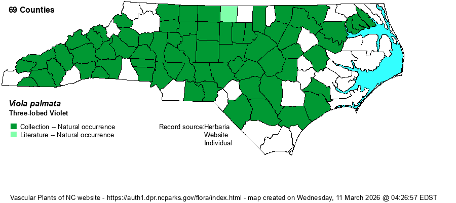 | Distribution | Essentially statewide, though apparently absent in the easternmost counties; no records east of Pasquotank, Martin, Pitt, and Jones counties. Quite a few SERNEC specimens need additional verification, as they might not be V. palmata upon further examination -- as several taxa have recently been pulled out from it.