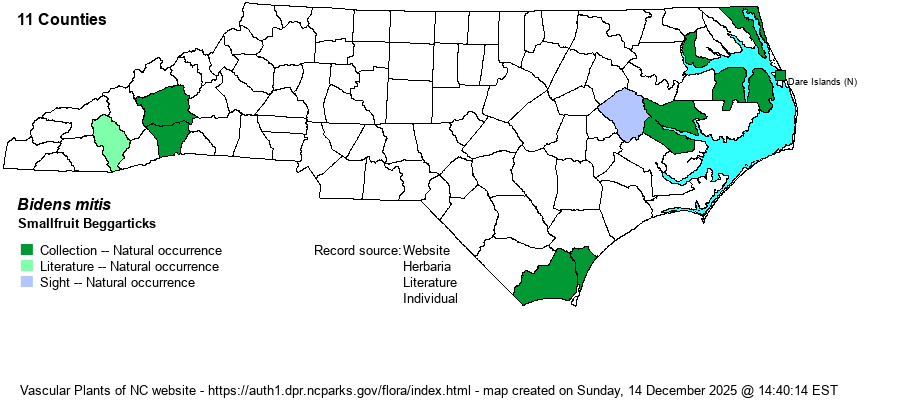 | Identification | This species grows 1-3 feet tall, with 3-parted leaves that are cleft into narrow segments. The heads are showy, with ray florets up to an inch long and thus the spread flower can be at least 2 inches across. Smallfruit Beggarticks can look similar to narrow-leaved individuals of Bearded Beggarticks (B. aristosa), but differs in its smaller seeds (2.5-5 mm vs. 5-8 mm). Bidens trichosperma has a very similar gestalt but often with narrower leaf segments; its seeds are about 7 mm long not including awns (vs. about 5 mm long). | |