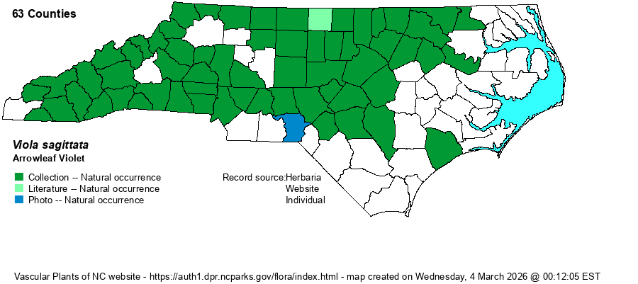 | Distribution | Essentially statewide, but seemingly absent from the easternmost counties; only one record known east of Hertford, Martin, and Sampson counties (for Onslow County). Note that there is some confusion between this species and V. emarginata, and some specimens of the latter might well be included on the map below. These two had been lumped into V. sagittata for a few years recently, then re-split back out by Ballard by 2024.